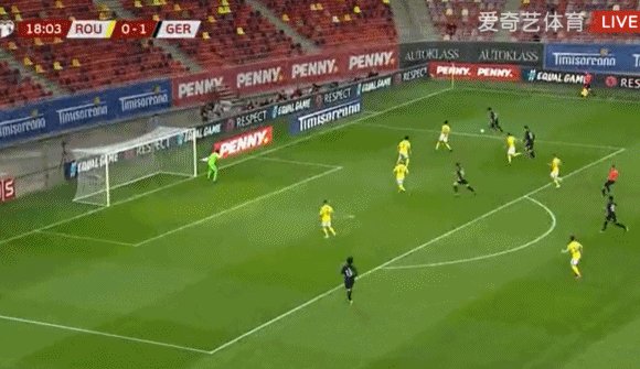 19'罗马尼亚解围不远,基米希外围远射折射后击中横梁,萨内补射也被化解